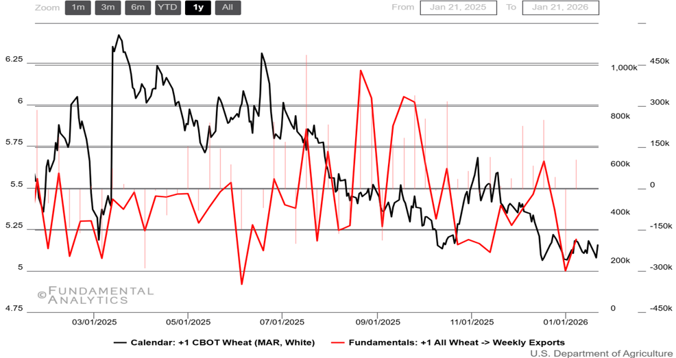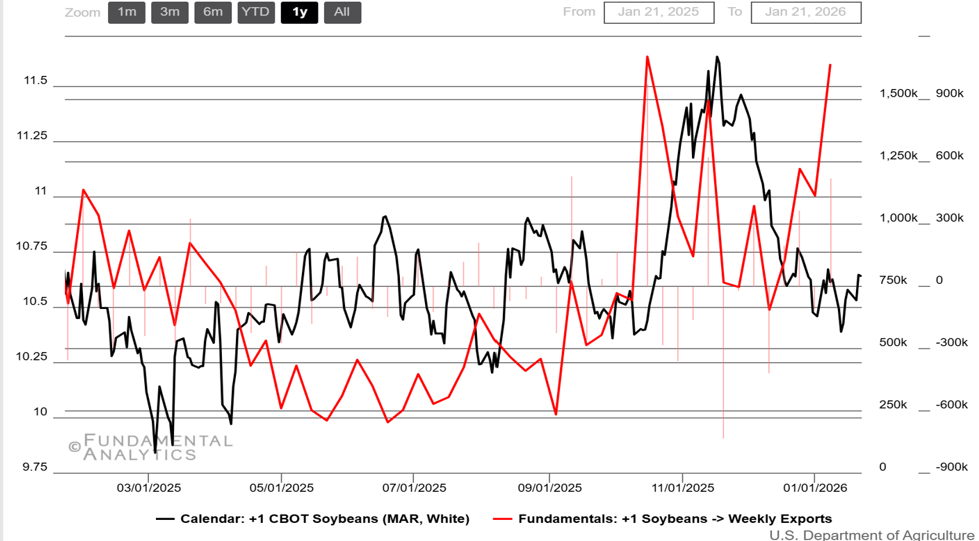 - U.S. sales pulse improved: Mid-January weekly export sales hit a marketing-year high, brightening near-term demand optics without offsetting heavier global supplies.