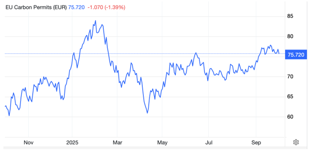 EU carbon allowance prices ended September at €75.72/t, down 1.39% on the day but still higher compared to recent months. Over the past month, prices gained 2.4% and remain nearly 19% above the same period last year. The market has trended upward from the lows of early summer, consolidating in the mid-to-high €70s/t through September. Analysts point to subdued industrial demand and steady auction volumes keeping a lid on stronger price moves, while firm power-sector emissions and expectations around tighter supply next year have provided underlying support. With the first maritime ETS compliance deadline now passed, traders are watching whether residual demand from shipping operators and the seasonal shift in the power mix will be sufficient to push EUAs out of their current range. For now, the market appears balanced, with carbon pricing signals broadly stable but sensitive to policy headlines and fourth-quarter energy dynamics.