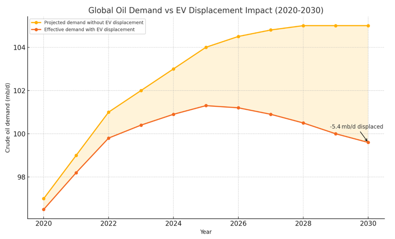 Renewables reinforce the shift. Wind and solar—already making up nearly all new global power capacity—are projected to provide over half of electricity generation by 2050 in most scenarios. As their share increases, oil-fired generation and even some natural gas demand are displaced. Transport is pivotal: EV penetration alone could displace 5–5.4 mb/d of crude demand by 2030 (Figure 1).
