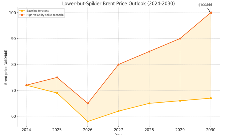 Taken together, a “lower but spikier” pricing regime emerges as the base case (Figure 2). Demand-side factors, electrification, and policy constraints point to Brent stabilizing in the $60–70/barrel range. But persistent underinvestment shortens supply elasticity, leaving prices vulnerable to geopolitical shocks and weather volatility. Risk managers should model both steady deceleration and spike scenarios—not assume a smooth glidepath.