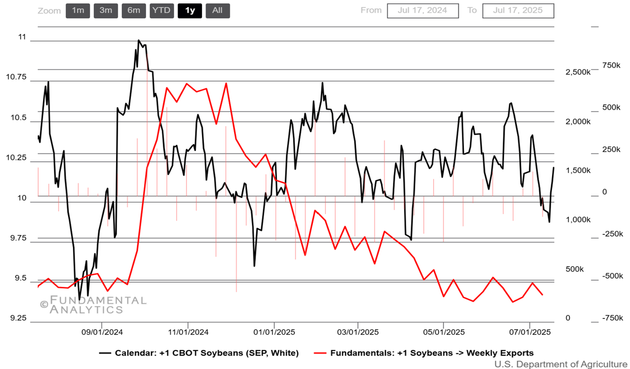 - Brazilian supply and loadings undercut U.S. values. CONAB reaffirmed a record ~197 MMT crop while exporter line-ups pointed to roughly 11–13 MMT of July shipments, reinforcing aggressive FOB offers that analysts say are chipping away at U.S. share and pressuring CBOT spreads.