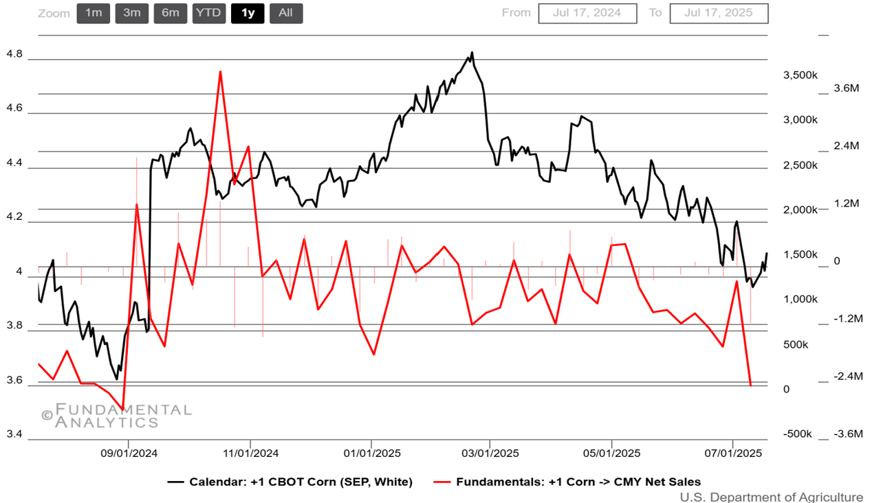 - Policy moves overseas reinforce a bearish narrative. The EU’s reinstated tariff‑rate quota caps duty‑free Ukrainian corn at just 650 kt for the rest of 2025, while Mexico’s constitutional ban on planting GM corn keeps trade friction with Washington alive—both shifts likely to reroute competitively priced grain and weigh on U.S. export prospects.