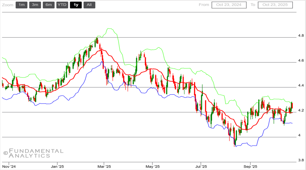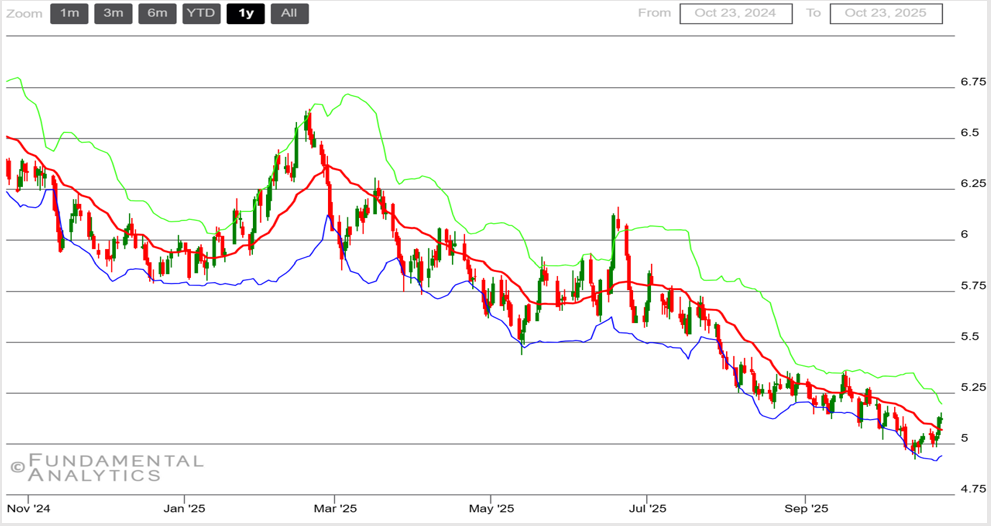 - Ethanol metrics offered only modest support. Mid-October EIA data showed plant output rising toward ~1.11 million bushels/day with inventories edging down; record-pace ethanol exports year-to-date helped at the margin but didn’t alter the broader bearish backdrop.