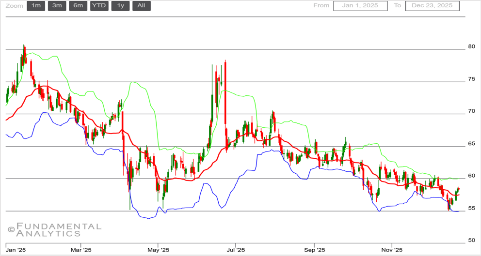 - Thin holiday trade, modest bounce: WTI rebounded from mid-month lows into the high $50s as desks faded API builds and weighed Venezuela/Russia headlines.