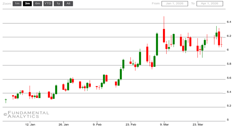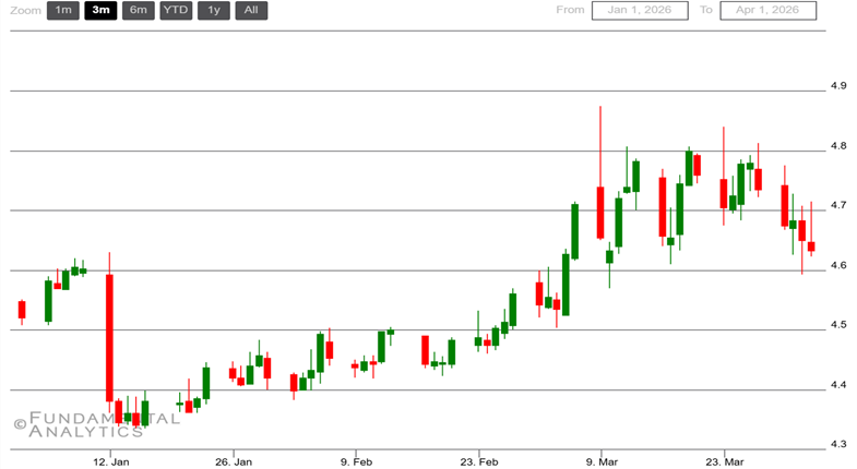 • U.S. weather + acreage tightened new-crop optionality: Early winter freeze headlines briefly lifted weather premium, then late-March High Plains drought expansion and the USDA spring planting survey signaling the smallest U.S. wheat area since records began shifted attention from “big stocks now” to “less supply later,” helping underpin July risk premia.