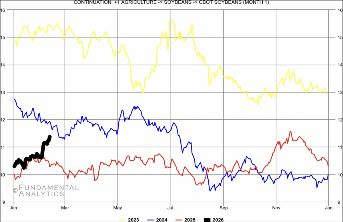 - Weather: The brutally cold weather in North America and Europe should have little effect on soybeans, which won’t be planted for several weeks to months. There is a 50–60% chance of a moderate El Niño for the fall of 2026, which would bring warmer and wetter weather to North America, but it might not be enough to make any difference.